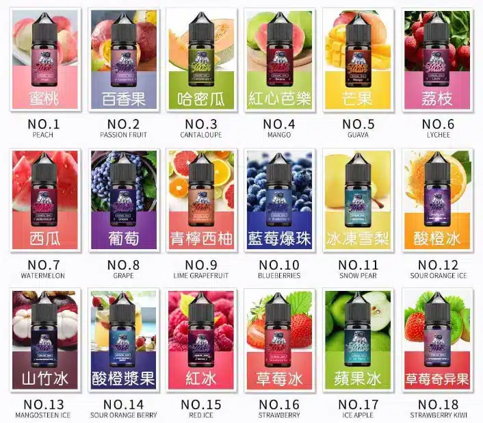 這款煙油提供多種口味選擇,包括水果、甜品、飲料以及傳統烟草風味。