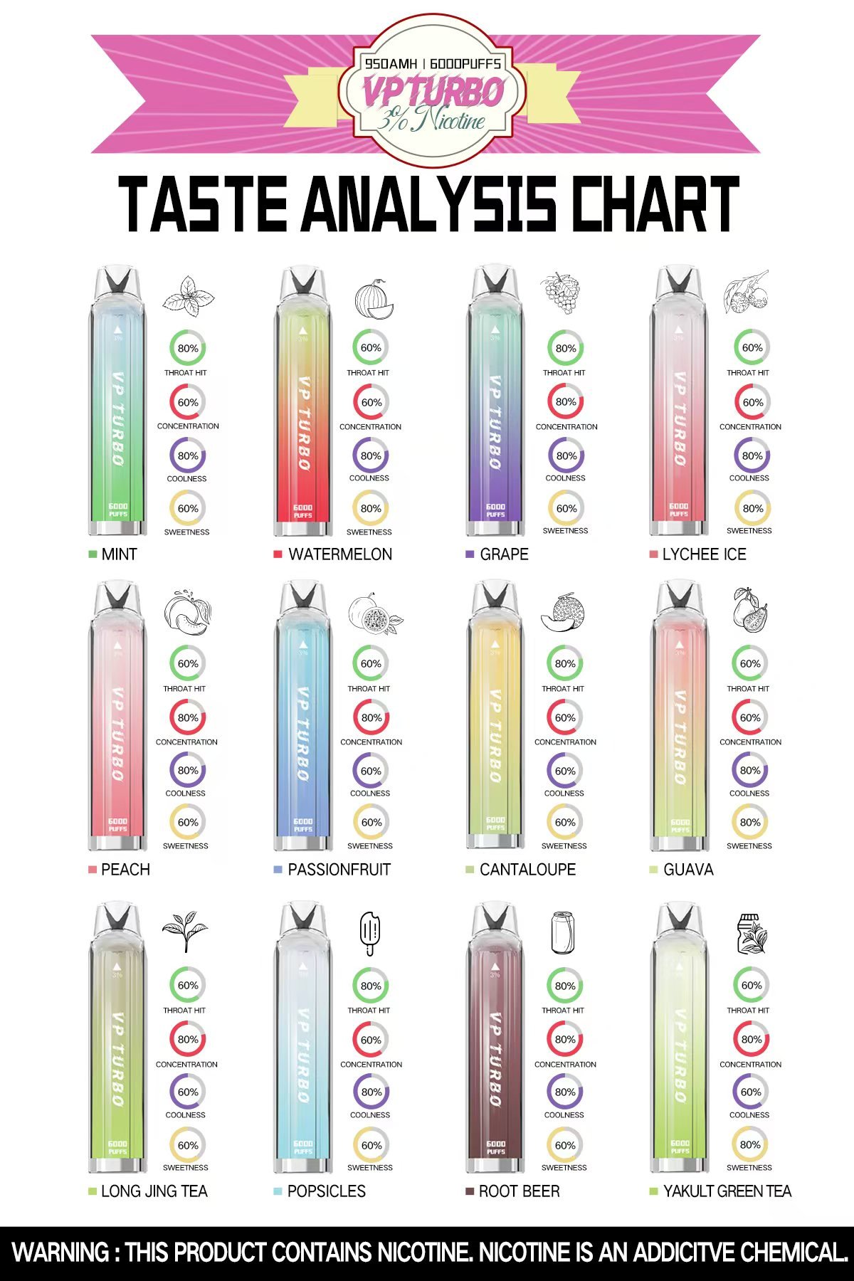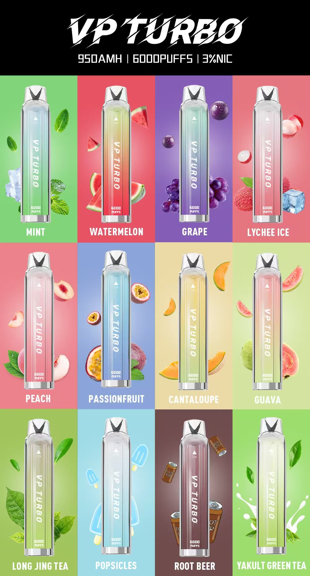 豐富口味:VP Turbo 6000提供多種口味選擇,包括荔枝、百香果、老冰棍、蜜桃、薄荷等,滿足不同用戶的口味偏好。